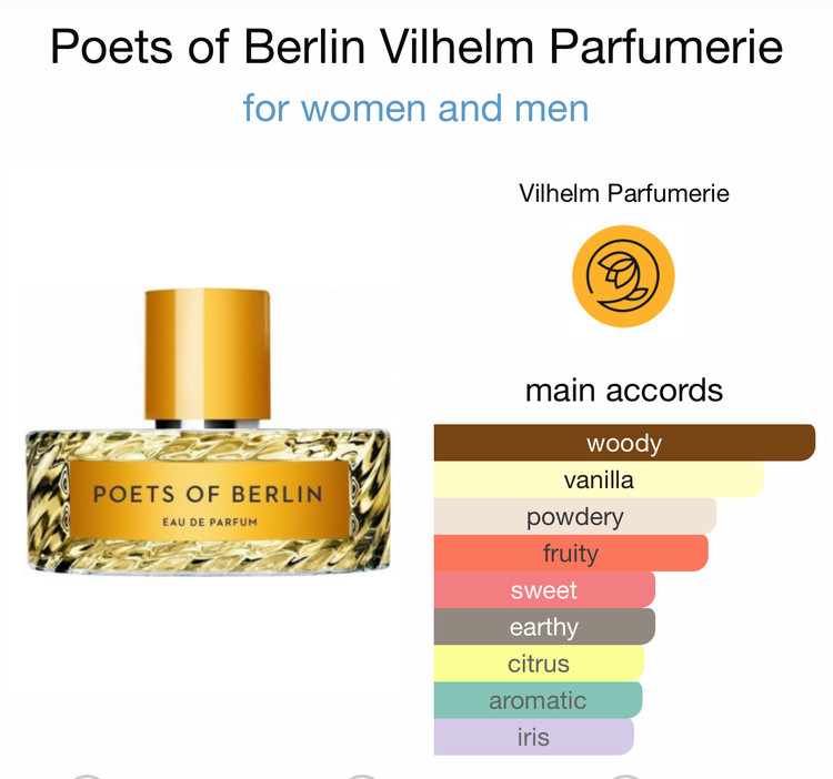 ویلهلم پارفومری پوئتس اف برلین عطری مردانه – زنانه ، شیک و خوش بو می باشد که در سال ۲۰۱۸ به بازار عرضه شده است . ویلهلم پارفومری پوئتس اف برلین در دسته عطر های رایحه های شرقی قرار می گیرد عطری که توسط عطرساز برجسته جرام اپینت خلق شده است . اسانس های بکار برده شده در این عطر لیمو ترش، بلوبری، ریشه زنبق، چوب خیزران، وانیل ، خس خس ، چوب صندل سفید می باشد.