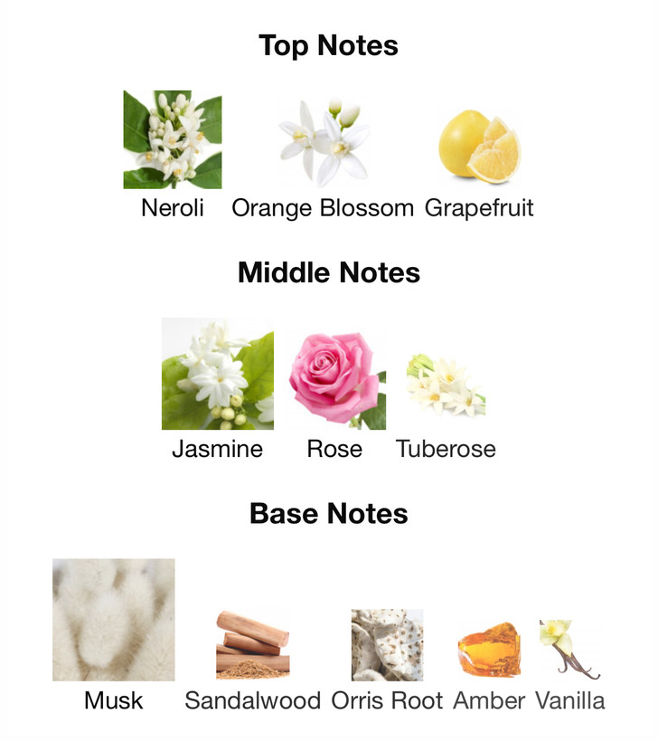 عطری است ساده، خنک، با طراوت و گلدار که با رایحه تمیز و صابونی مانند شکوفه های پرتقال و گل رز آغاز می شود که بسیار انرژی بخش است. با گدر زمان حس تمیز شکوفه های پرتقال کماکان حس می شود و حال با اضافه شدن زنبق عطر حس پودری و شیکی پیدا می کند.
